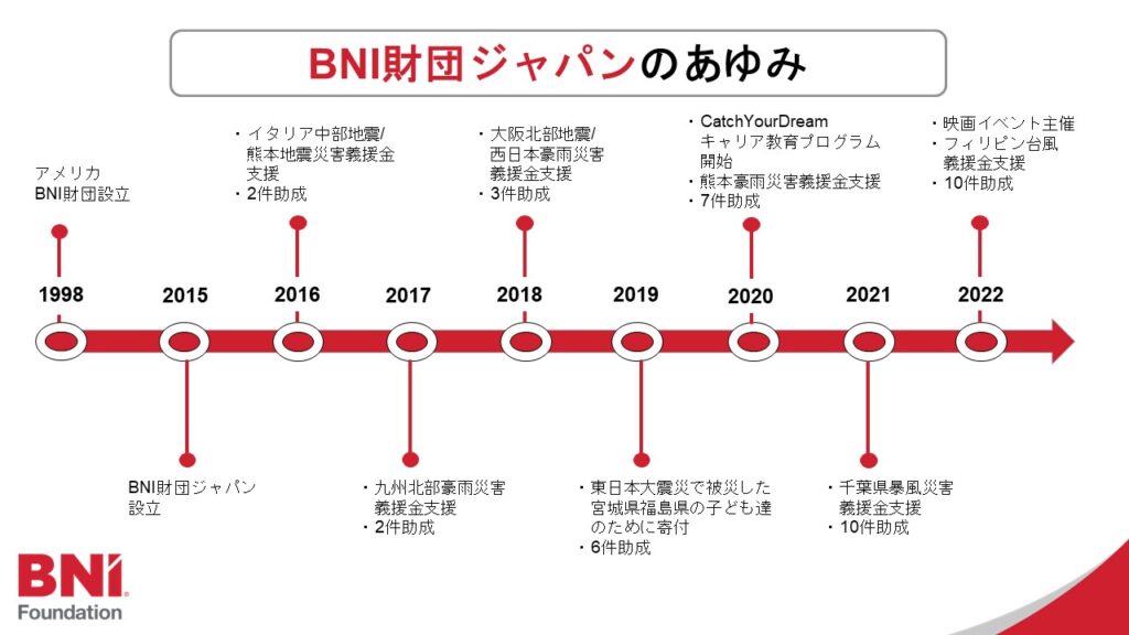 BNI財団は、BNI創立者であるアイヴァン・マイズナーと故ベス・マイズナーが1998年に設立。日本では2015年7月17日に、一般財団法人BNI財団ジャパンとして設立された。