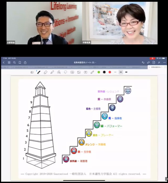 宇敷:赤外線「被害者」、赤「生存者」、オレンジ「労働者」までのラインは会社員、その次に黄「プレーヤー」、緑「パフォーマー」、青「指揮者」とあって、藍「主催者」から紫「作曲家」、紫外線「レジェンド」のこの3つは、開発したロジャー・ハミルトン氏曰く、世界の1%の人が入るくらいのレベルで、視野が広すぎて普通の人には必要ないかもしれません(笑)。紫外線のレベルは、条件は(自分が)死んでいなければいけないという(笑)。もちろんここまでを目指すのはありですし、ここまであるのがウェルススペクトルのユニークさでもあります。大野さんも上位3つのレベルに近づいているんじゃないですか?